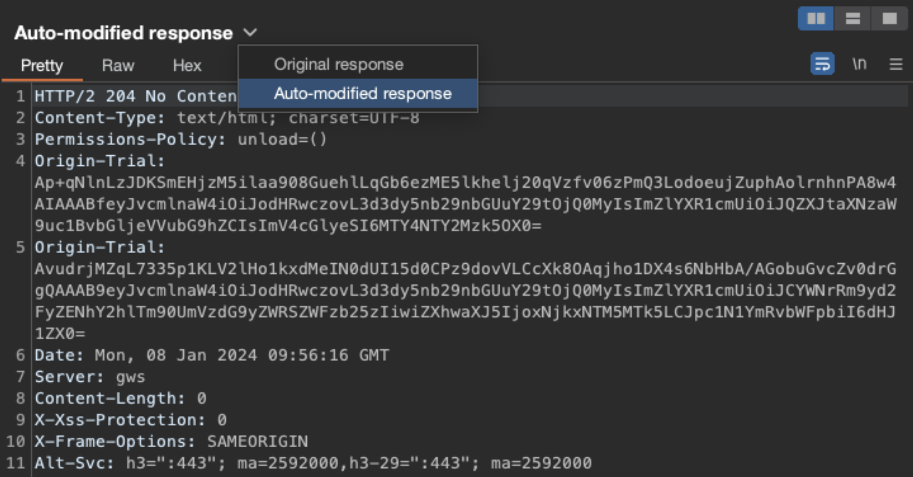 After selecting the request, choose the Auto-modified response to show that Burp removed the CSP header: