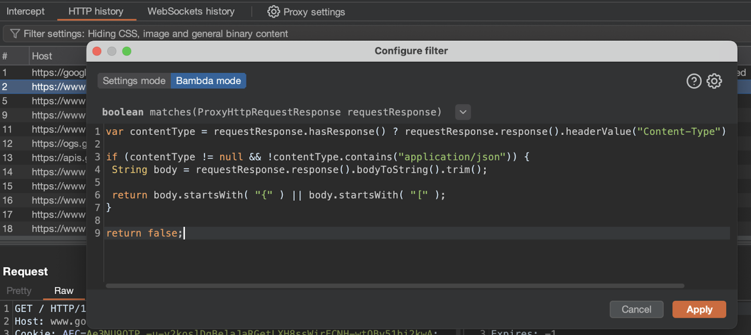 - Narrow down the source of the request sent to Autorize by setting up interception filters. For example, include only scope items