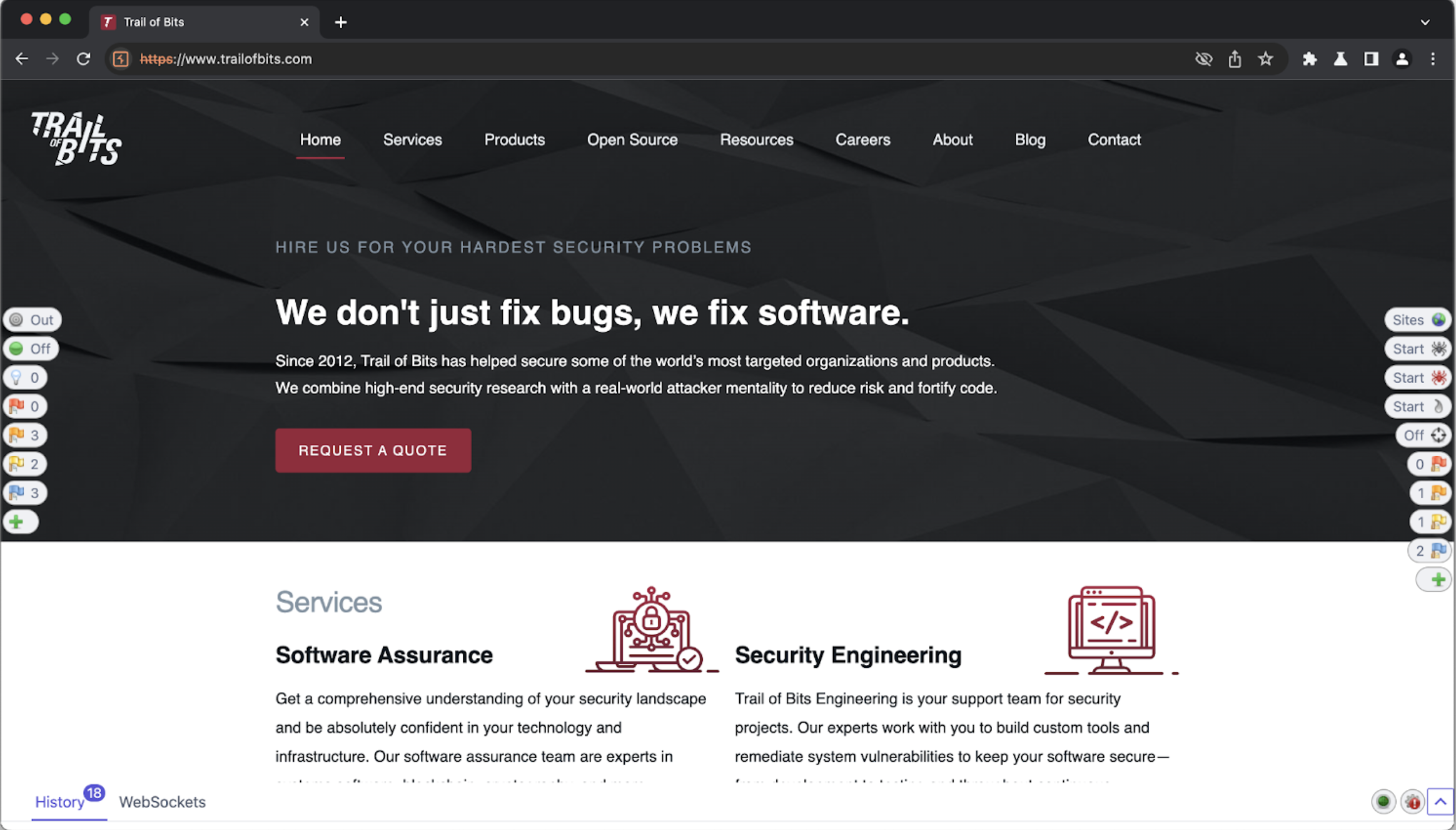 In Burp Suite’s built-in browser, opening trailofbits.com appears as follows: