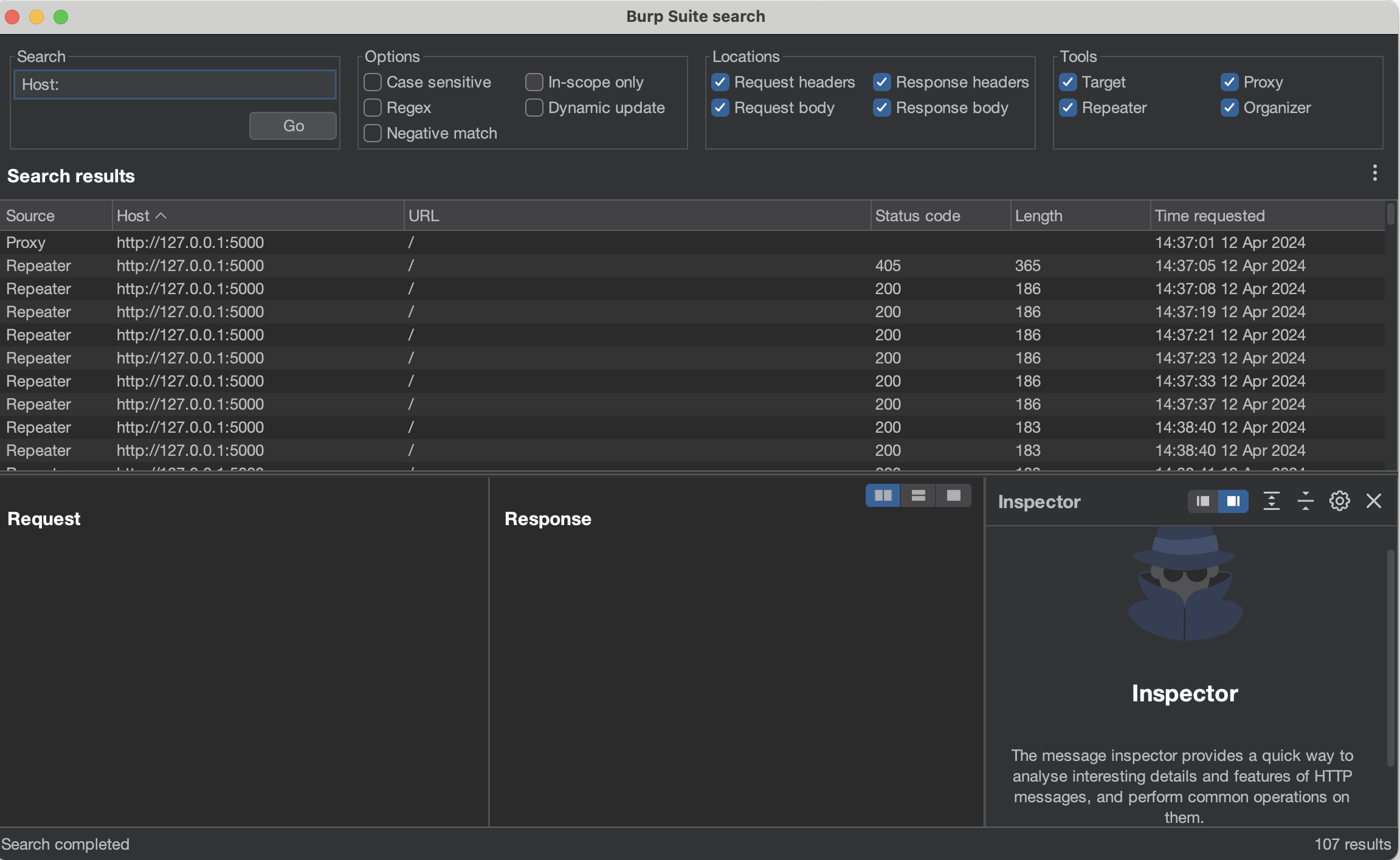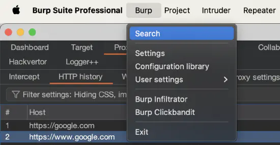 Let’s say you need to find a certain value or error string, but you can’t remember where you saw it (i.e., in which Burp tool). Was it in Burp Repeater, Burp Scanner, Burp Target? To find it, use the global search in Burp Suite (accessible via Burp > Search):