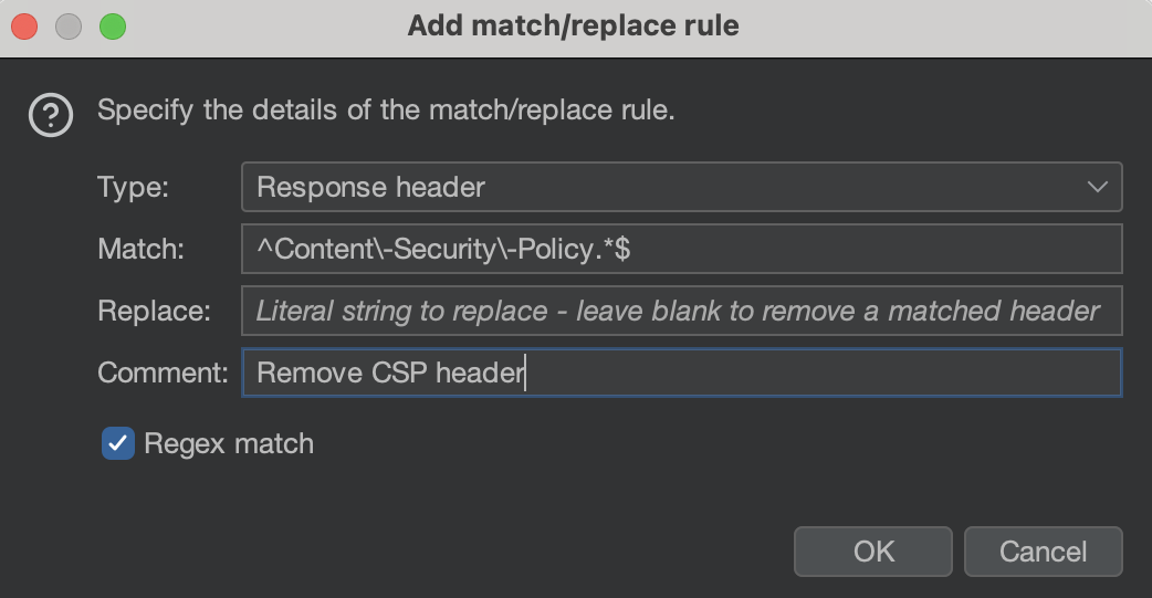 For example, to remove the Content-Security-Policy header from the response, under the Match and replace rules header,
