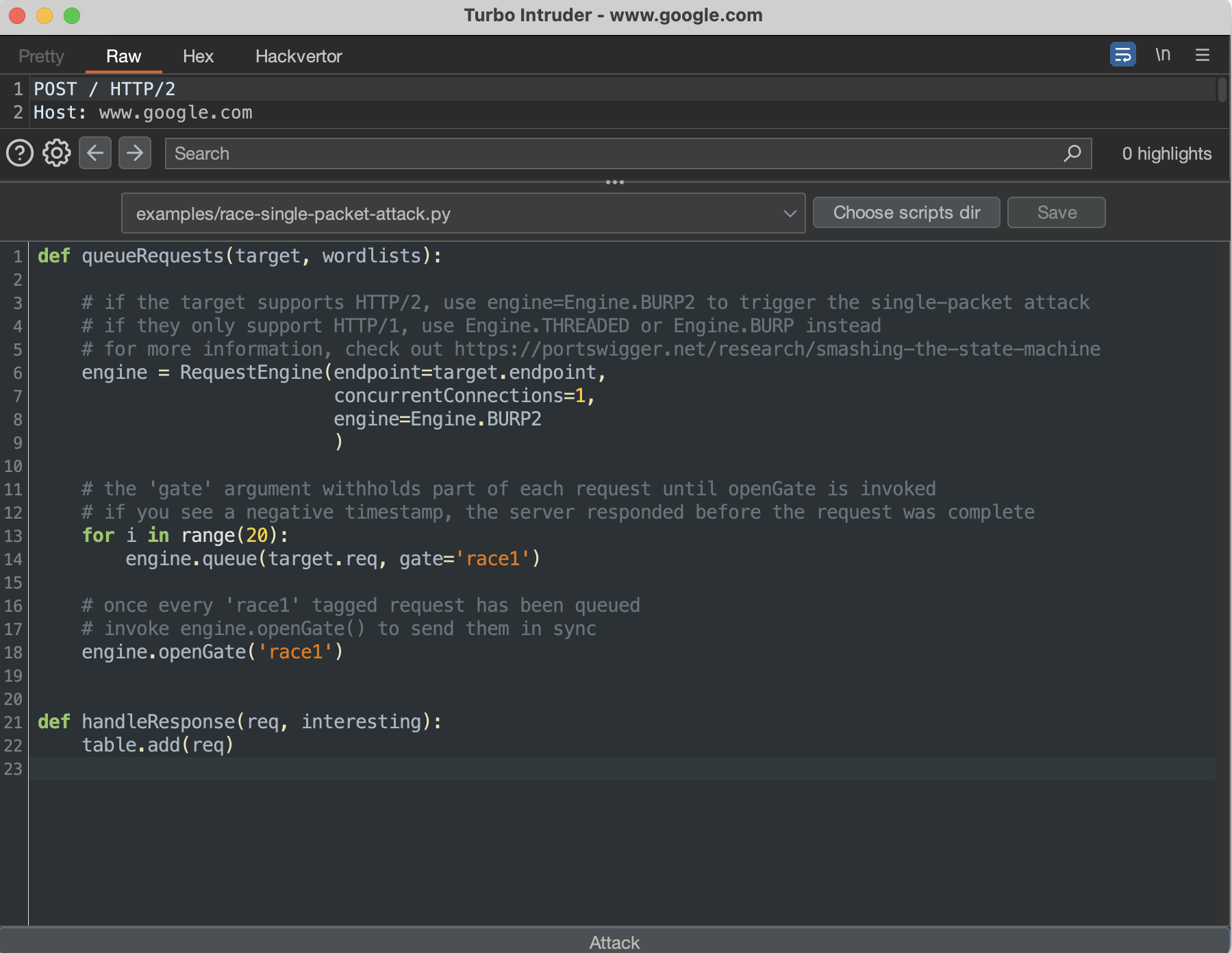 race-single-packet-attack.py Turbo Intruder scriptNext, following comments in the chosen script, adjust the engine (line 8) to the number of queued requests in line 14, click Attack, and observe the results.