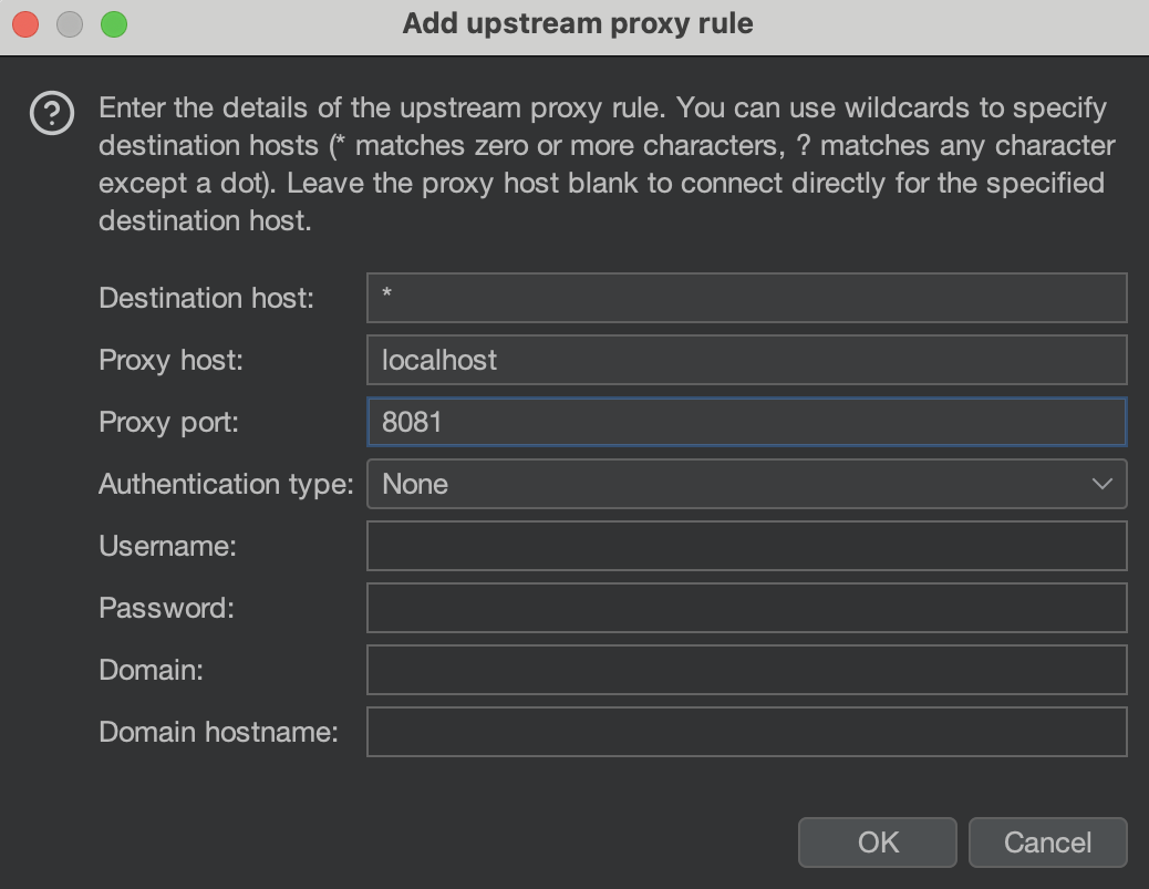 To configure an upstream proxy, go to Settings > Network > Connections and scroll down to the Upstream proxy servers section. Click Add to configure a new upstream proxy. In the pop-up window, specify the destination host, the proxy host or IP address, and the proxy port. If the proxy requires authentication, further specify authentication-relevant information such as the authentication type, username, and password.