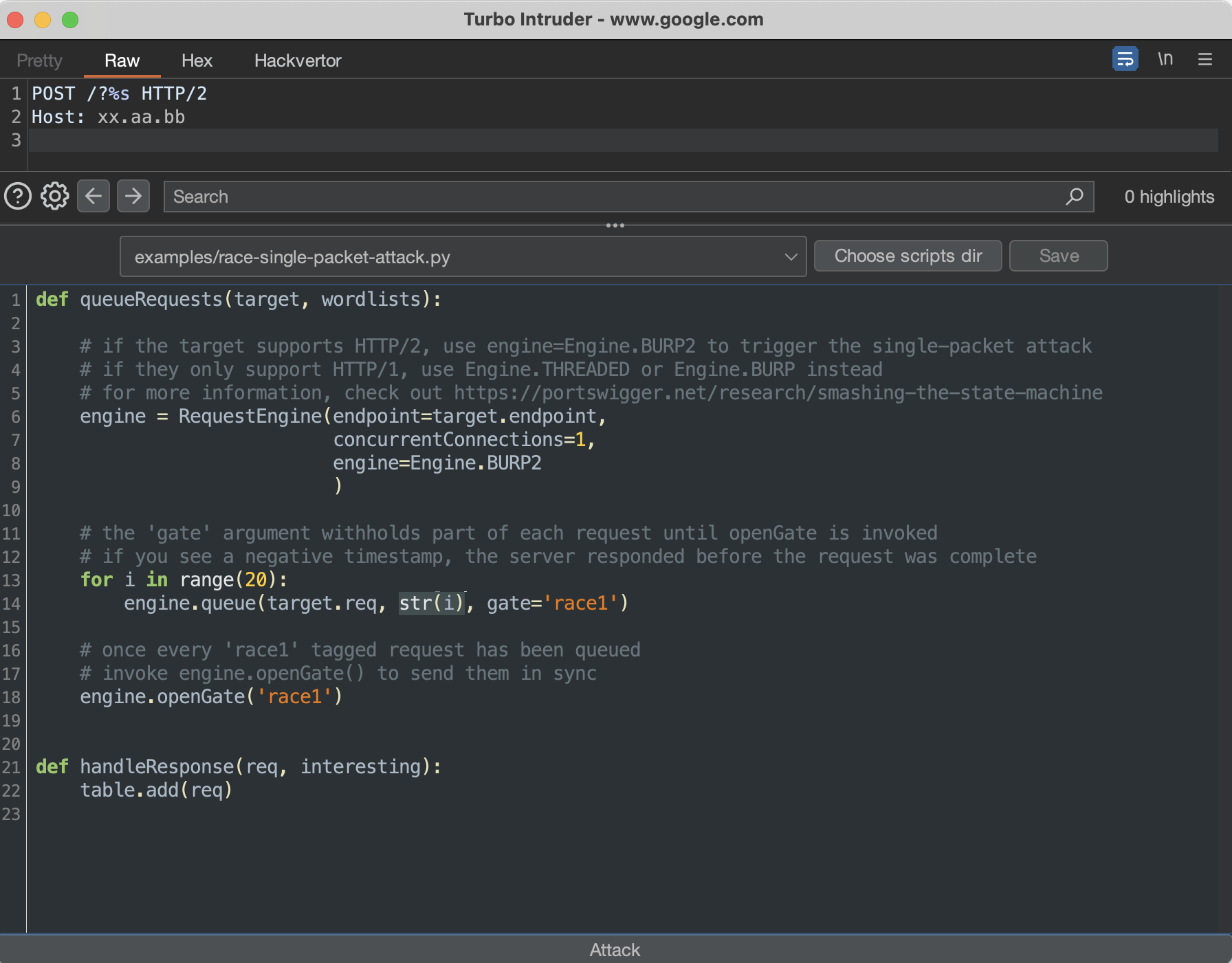 race-single-packet-attack.py Turbo Intruder scriptNext, following comments in the chosen script, adjust the engine (line 8) to the number of queued requests in line 14, click Attack, and observe the results.